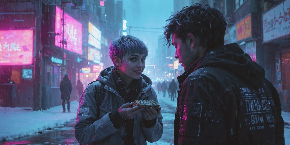 Star’s expression softened as she looked up at the falling snow. “Ain’t in the creds or the towers or the neon. It’s here. Right now. Snow fallin’, granola crumbs, someone t’ share it with.” She smiled, her neon tattoos catching the faint light. “That’s the truth, darlin’. An’ most people don’t even see it.”